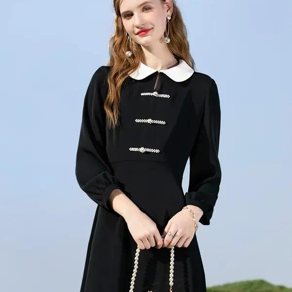 This dress shines across seasons but is especially suited for the autumn months. Whether you're heading to the office, attending a business meeting, or going to a weekend brunch, its versatile design makes it an ideal choice for both day and night. The sophisticated collar and button accents provide a professional yet fashionable edge, making it perfect for 'office lady' chic or an elegant social gathering.