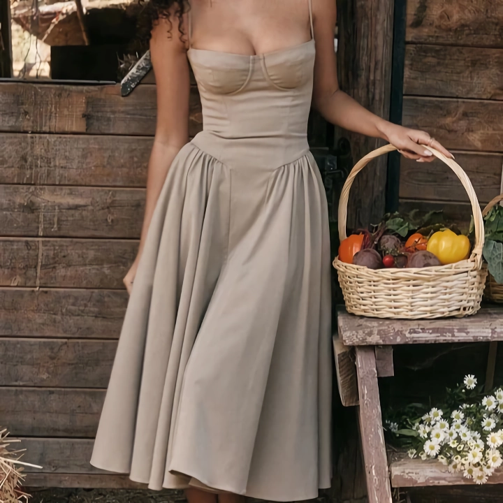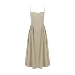Step into Summer Elegance with Our Khaki Spaghetti Strap Midi Dress