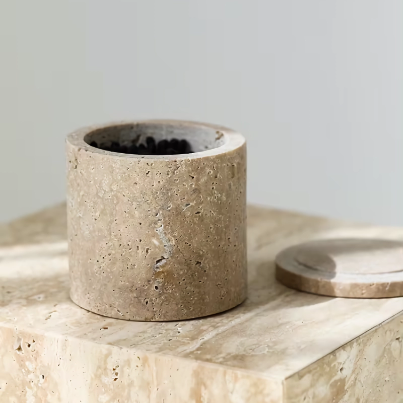 Travertine is a natural stone renowned for its durability and unique texture. Each piece has its own distinct pattern, ensuring that your container is truly one-of-a-kind. The stone’s natural coolness makes it an excellent choice for preserving the freshness of spices and other contents. Plus, its substantial weight ensures it stays put, providing stability wherever you place it.