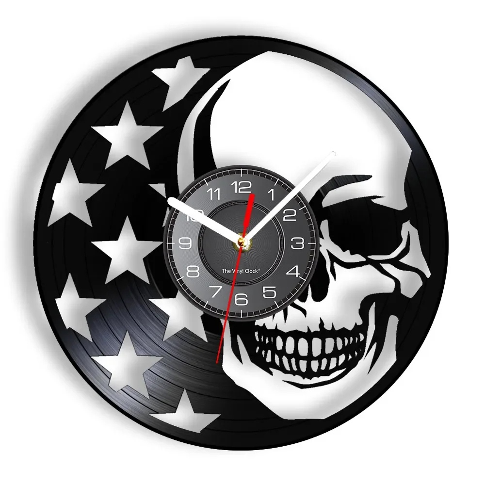 Add a touch of gothic charm and patriotic flair to your home with the Skull USA Flag Gothic Wall Clock. This stunning piece is more than just a timekeeper; it's a statement of style and personality. Crafted from recycled vinyl records, this wall clock combines modern art with vintage vibes, creating a unique addition to any interior. The intricate laser-cut design features a skull adorned with the American flag, making it a perfect piece for those who appreciate both gothic and patriotic aesthetics. One of the standout features of this wall clock is its eco-friendly construction. Each clock is made from a preloved LP vinyl record, giving new life to materials that would otherwise go to waste. This not only reduces the consumption of new raw materials but also provides a nostalgic touch for music lovers. The clock mechanism is powered by a silent quartz movement, ensuring it won't disturb your peace and quiet. Whether placed in a living room, bedroom, office, or any other space, this clock is sure to draw attention and compliments.