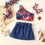 Get ready to capture the spirit of Independence Day with this vibrant and stylish two-piece set for toddler girls. Perfect for summer celebrations, this ensemble features a one-shoulder tie dye tank top paired with a chic belted denim skirt. It's not just about looking great, but also feeling comfortable in soft, stretchable materials that move with your little one's adventures.