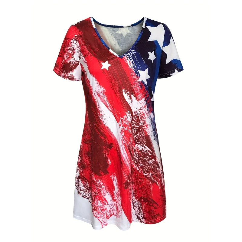 • Design: American flag print, V-neck, short sleeves, knee-length, A-line silhouette